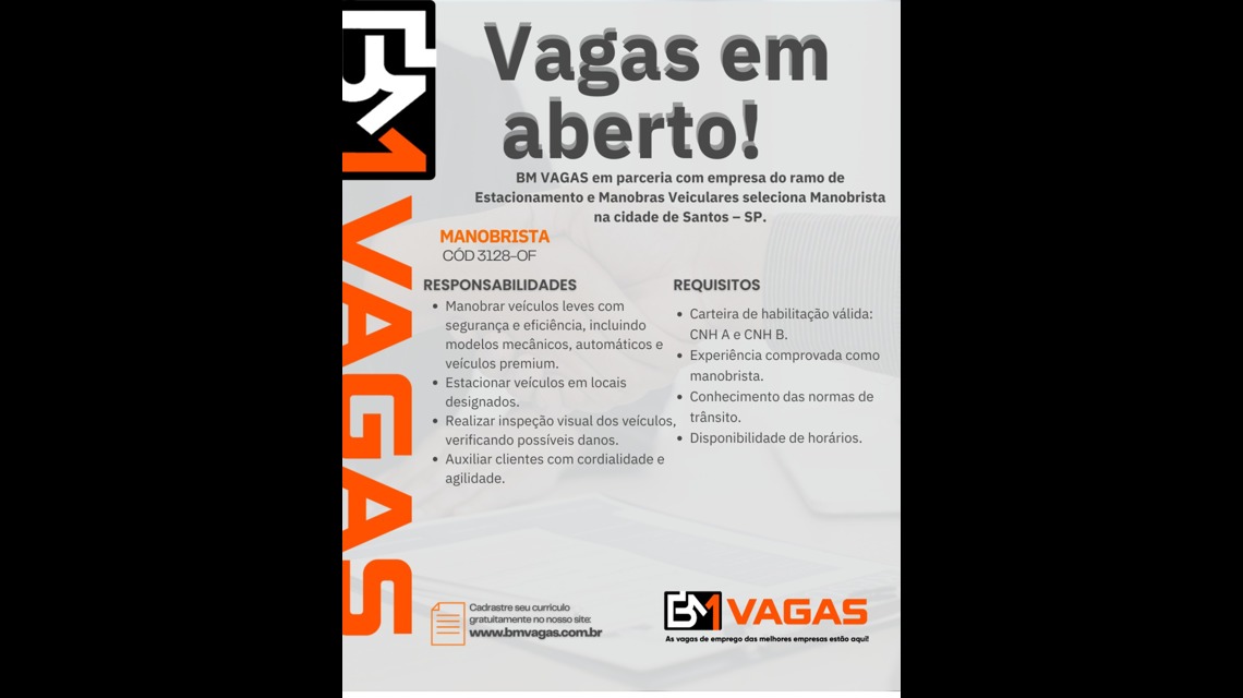 BM VAGAS em parceria com grande empresa do ramo de Estacionamento e Manobras Veiculares seleciona Manobrista na cidade de Santos/SP.